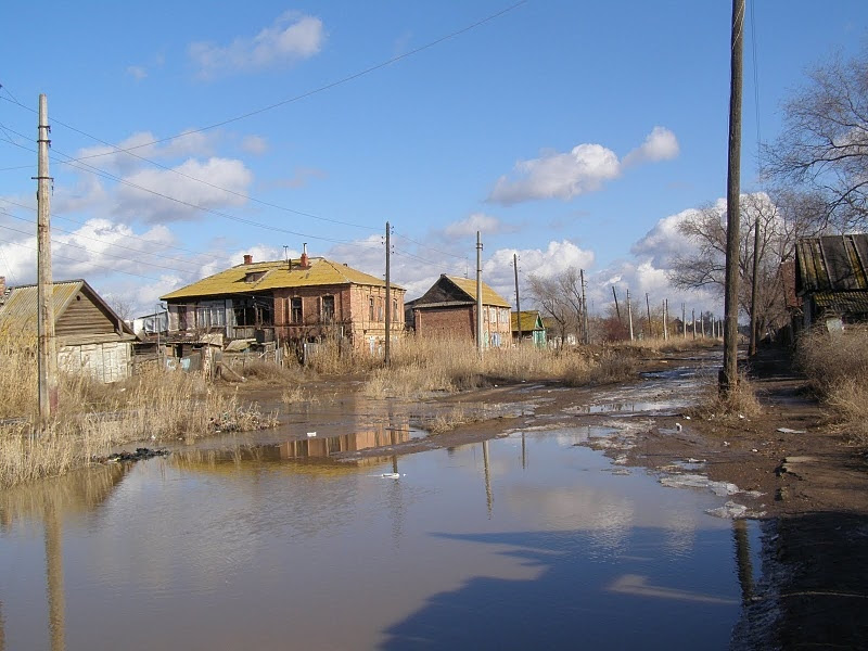 A view typical of Astrakhan – a poor hut on the background of a huge hypermarket.